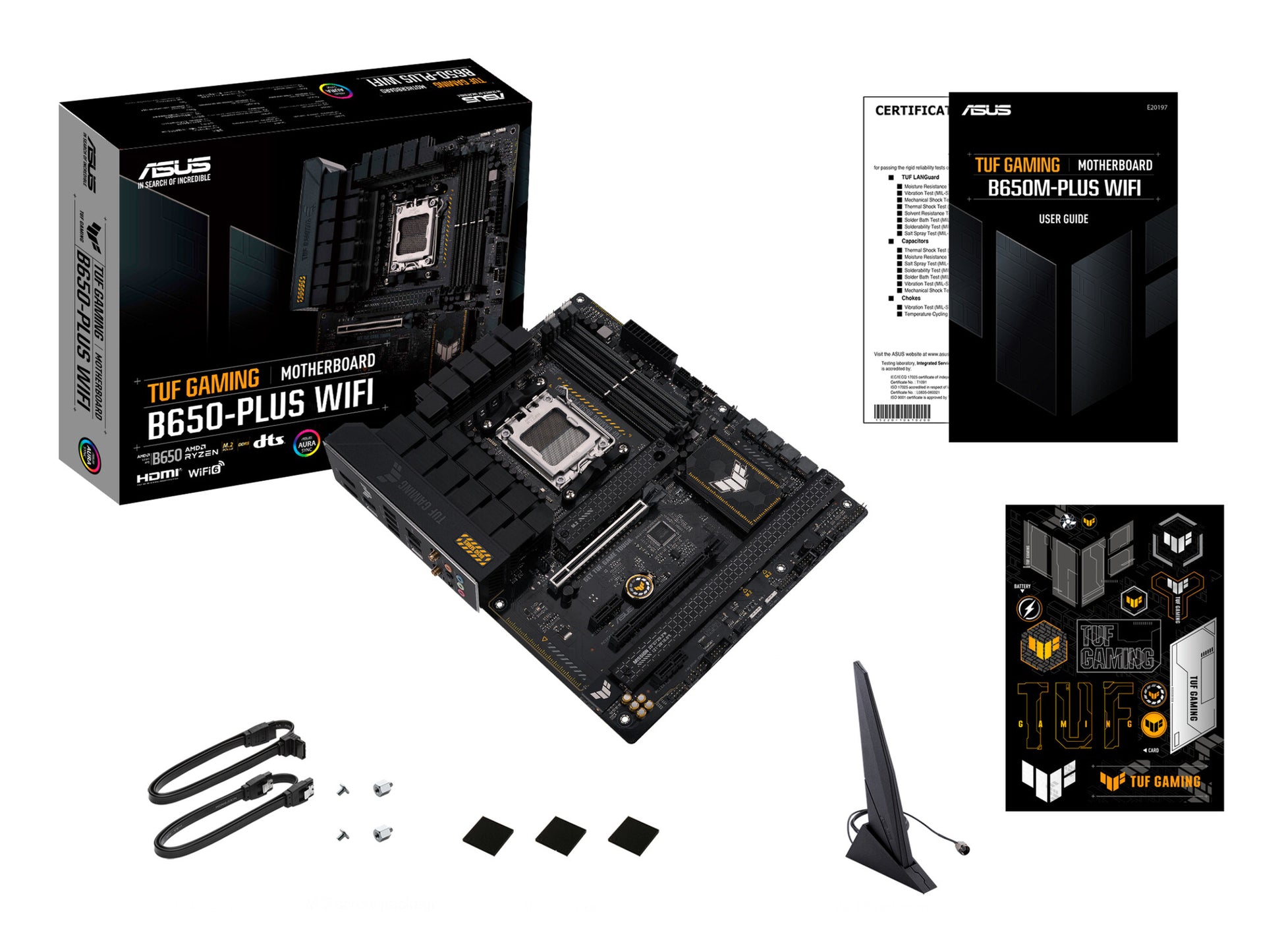 ASUS TUF GAMING B650-PLUS WIFI. Processortillverkare: AMD, Processorsockel: AM5-sockel, Kompatibla processorer: AMD Ryzen 7000 Series. Minnestyper som stöds: DDR5-SDRAM, Maximalt internminne: 128 GB, Minnesplatser, typ: DIMM. Lagringsenhetsgränssnitt som stöds: M.2, SATA III, Typer av lagringsenheter som stöds: HDD & SSD, RAID-nivåer: 0, 1, 10. Typ av ethernet-gränssnitt: 2.5 Gigabit Ethernet, Wi-Fi-standard: Wi-Fi 6 (802.11ax), Wi-Fi-standarder: 802.11a, 802.11b, 802.11g, Wi-Fi 4 (802.11n), Wi-Fi 5 (802.11ac), Wi-Fi 6 (802.11ax). Komponent för: PC, Moderkort formfaktor: ATX, Moderkort, chipsetfamilj: AMD
