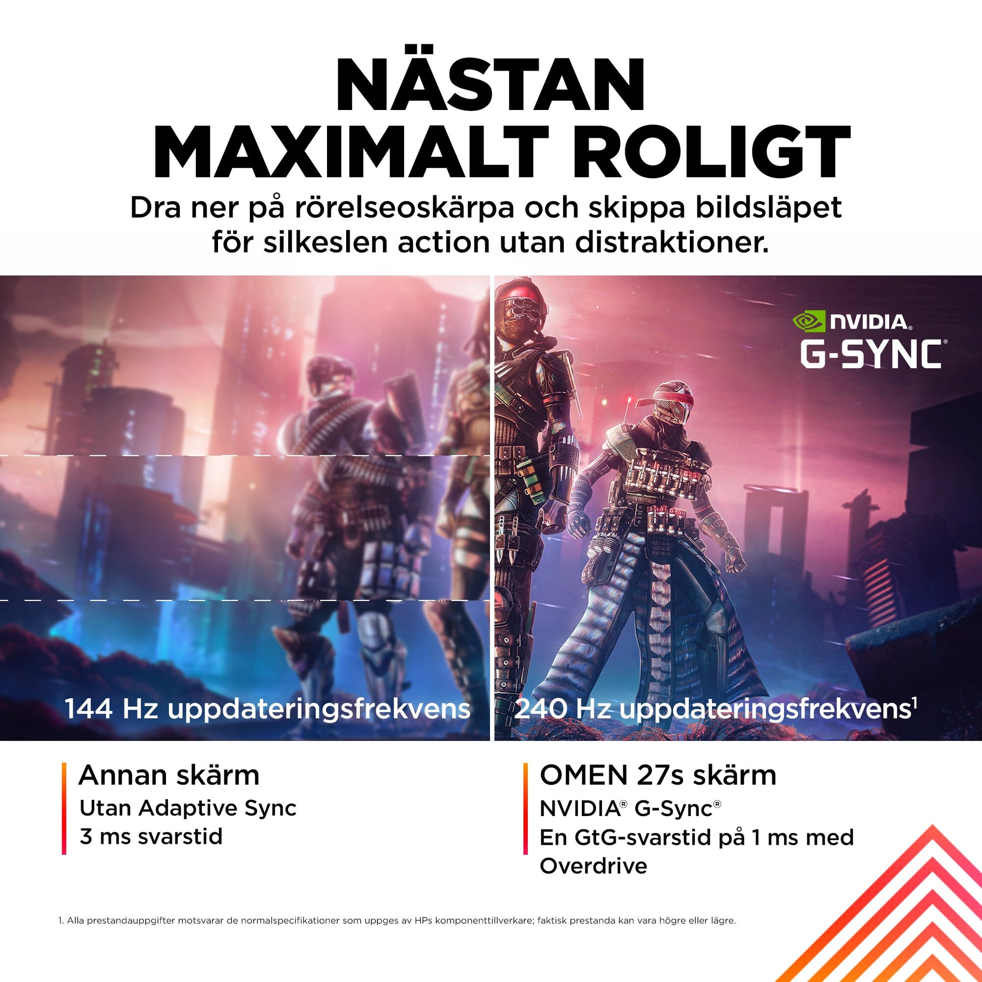 - Upplev laggfri action, en bildruta åt gången, med en uppdateringsfrekvens på 240 Hz och en svarstid på 1 ms GTG-svarstid med övertid [1] på en gaming-skärm där bildsläp och lagg är ett minne blott tack vare NVIDIA® G-SYNC®-kompatibilitet.